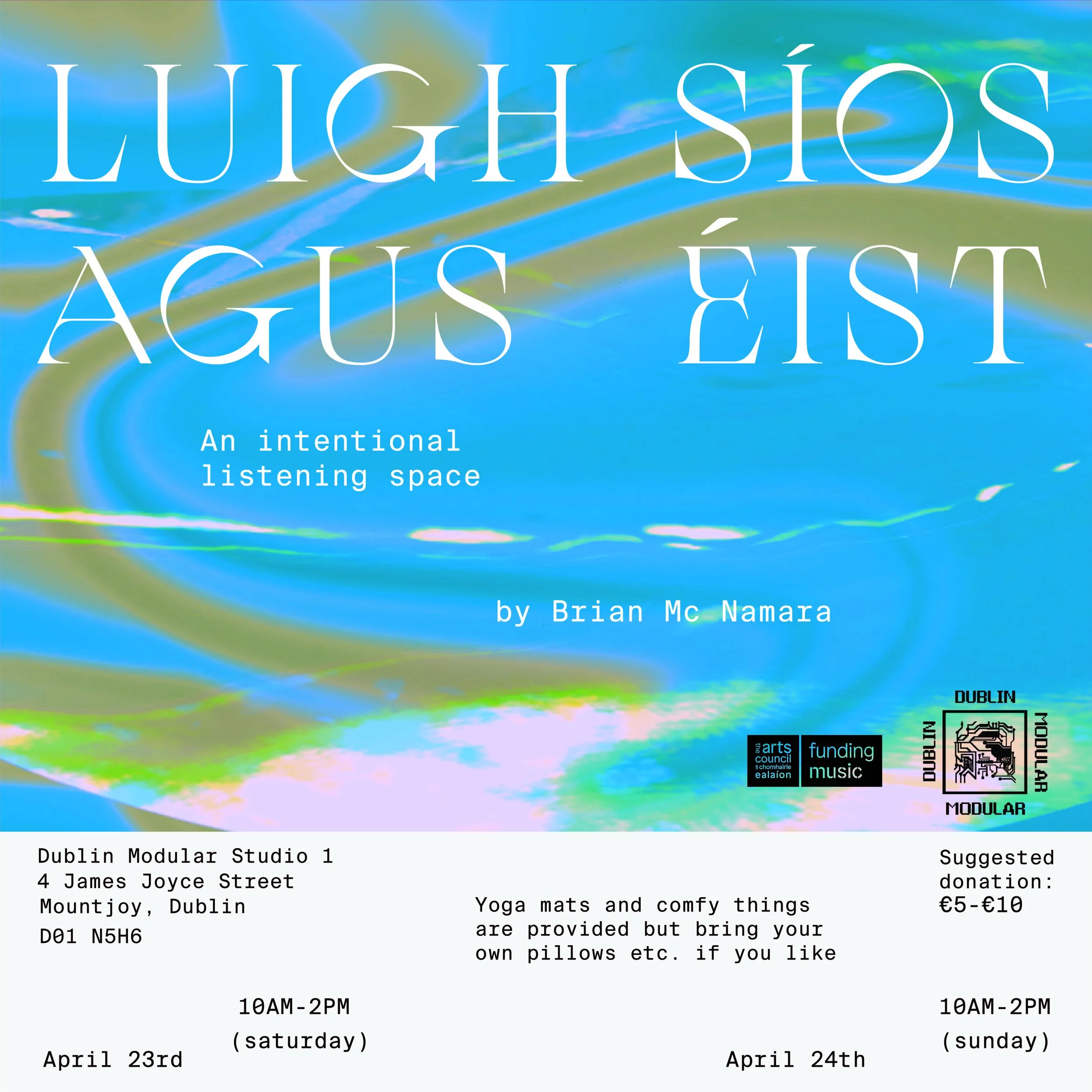 Luigh Síos Agus Éist was a temporary sound installation and intentional listening space that took place in Dublin Modular Studio 1, 4 James Joyce Street, Mountjoy, Dublin on the mornings of Saturday 23rd and Sunday 24th April 2022.